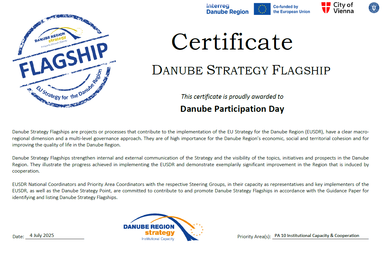 We are proud to announce that the Danube Participation Day has been selected as a Danube Strategy Flagship project for the third time. Following previous recognitions in 2022 and 2023, the event once again joins a selected group of initiatives that significantly contribute to the goals of the EU Strategy for the Danube Region (EUSDR).